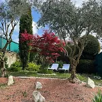 Från fönstren kan du njuta av utsikten över trädgården. I badrummet finns även en separat toalett och en dusch. Hårtorkar, badlakan och handdukar ingår för extra komfort.